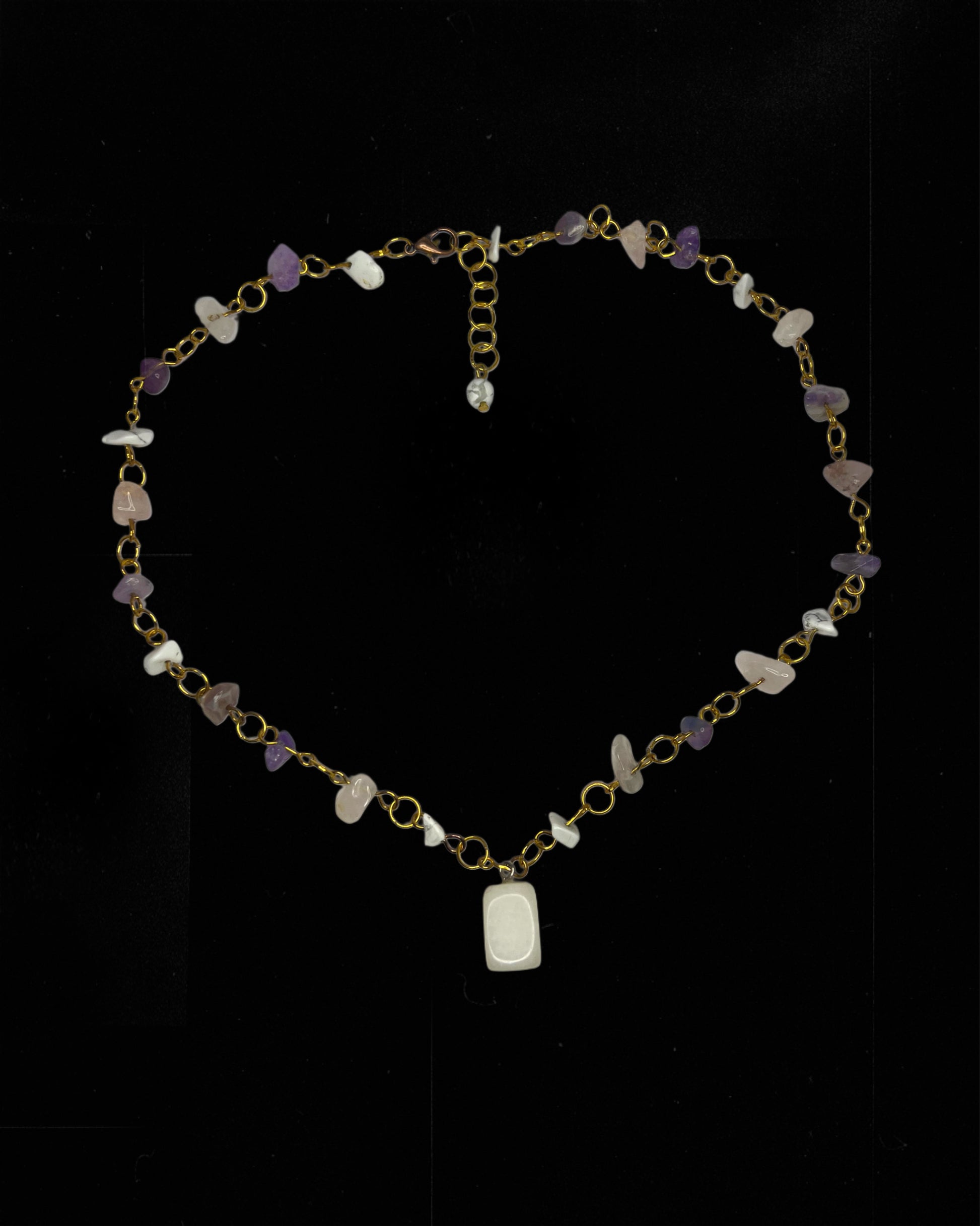 A luminous white quartz pendant sits at the crossroads of intention and intuition, cradled by fragments of amethyst and quartz that amplify its power.