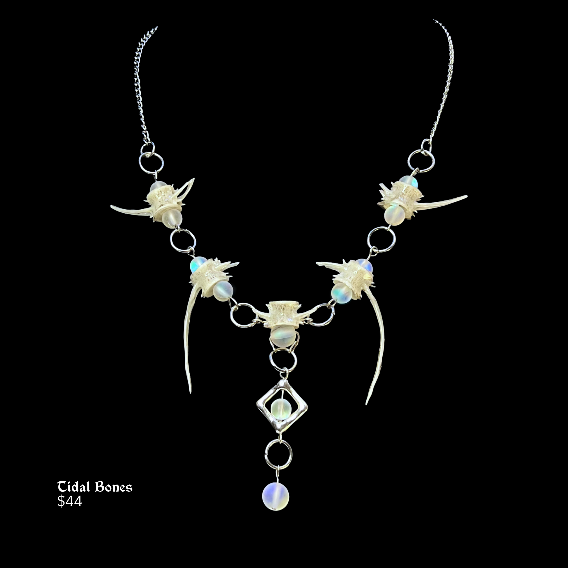 Tidal Bones is a 17" necklace made from fish vertebrae and Mystic Aura Quartz beads. The bones were discovered along the shore of Lake Ontario and cleaned, whitened, and coated in UV resin for durability.